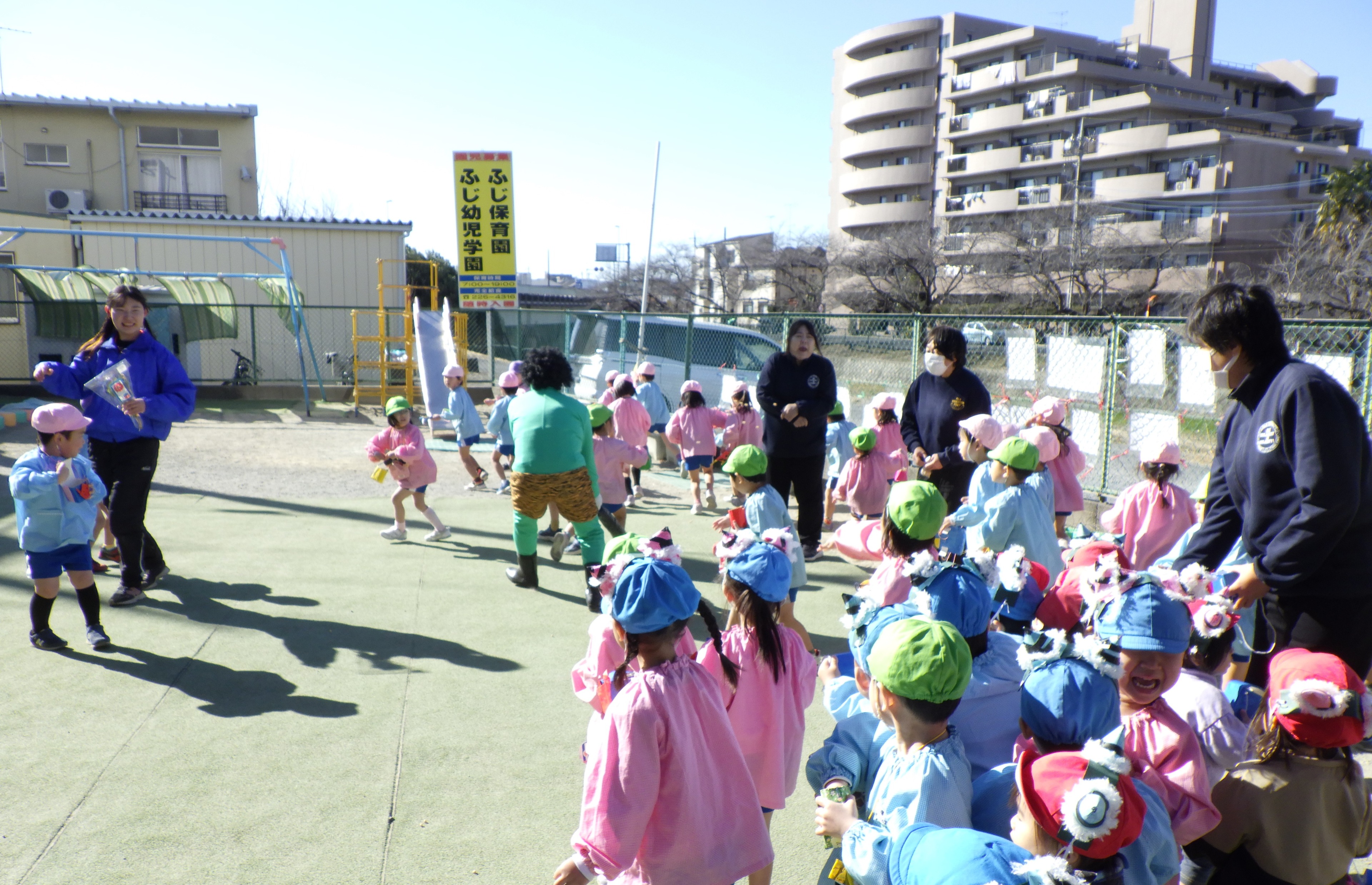 先生からなぜ豆まきをするのか話を聞いて、豆まきの歌を歌っていると・・・